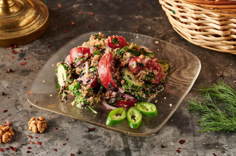 Грузинский салат из свежих помидор и огурцов с зеленью и грецким орехом и с острым перцем 200 гр